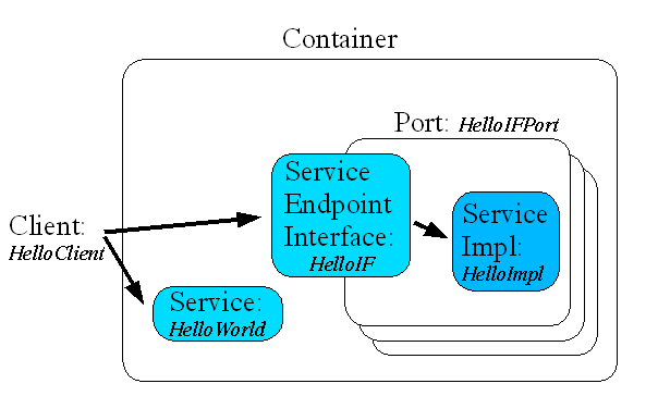 In the client container, the HelloClient application client uses JNDI lookup to access the HelloWorld Service object, gets access to HelloIFPort, and invokes the sayHello method, which accepts a string parameter and then returns a string.